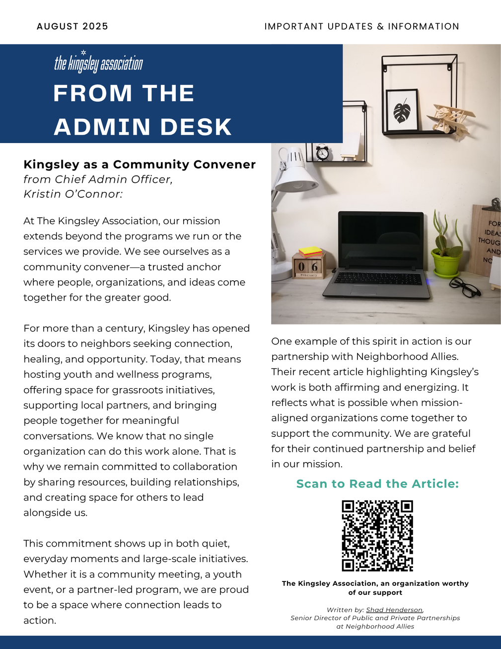 An update from the Admin Desk about Kingsley’s ongoing role as a community convener