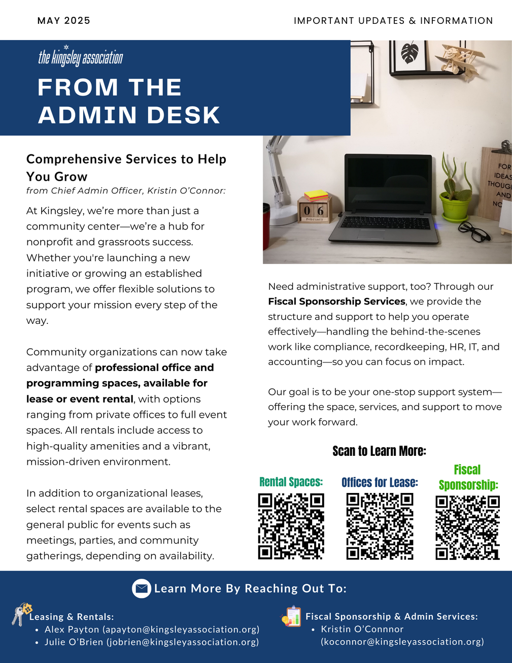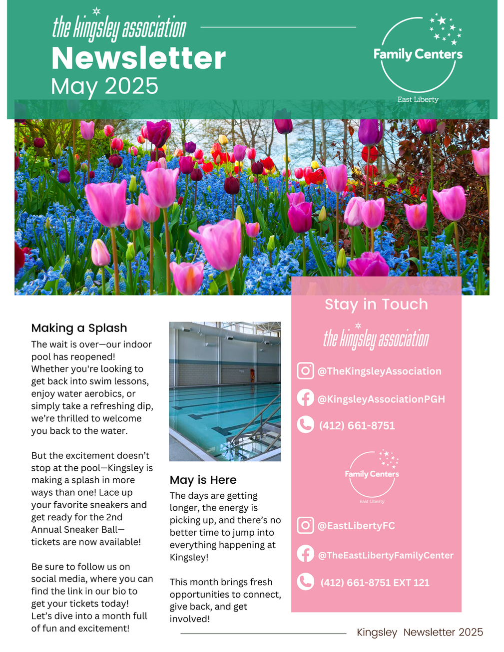 As the days grow longer and the weather warms, the Kingsley Association is bursting with exciting updates, events, and opportunities to connect! Our May 2025 newsletter is packed with community news, wellness highlights, and springtime celebrations you won’t want to miss.